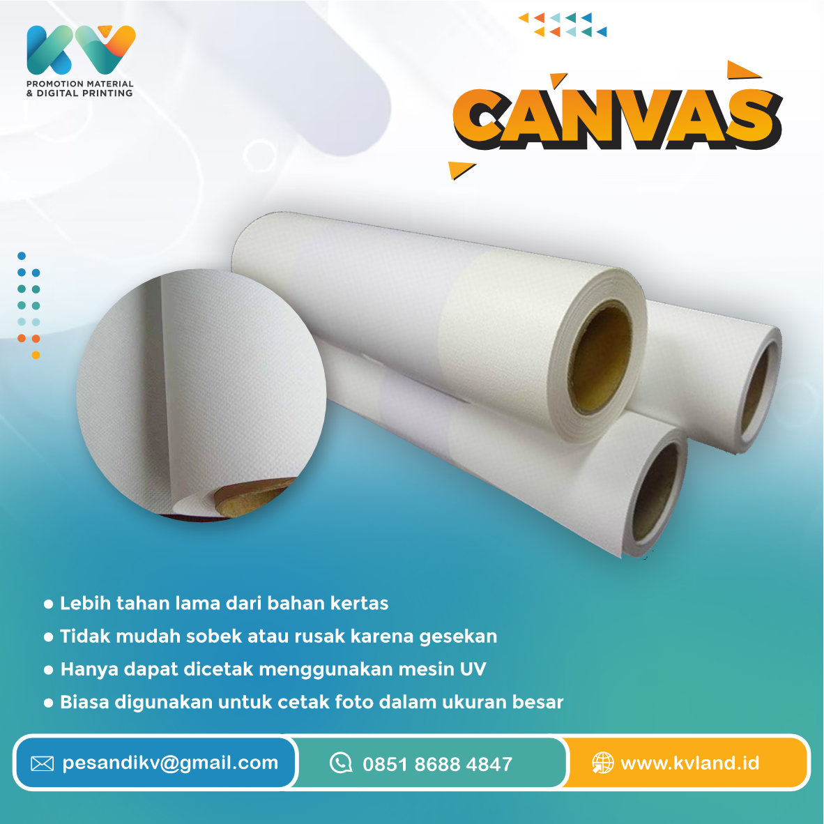 Bahan kanvas cukup unik dan berbeda dari bahan kertas karena memadukan material katun dengan bahan lapisan khusus serta memiliki ketebalan dua kali lebih tebal dari kertas foto biasa. Jadi kamu tak perlu takut apabila robek atau rusak karena gesekan.